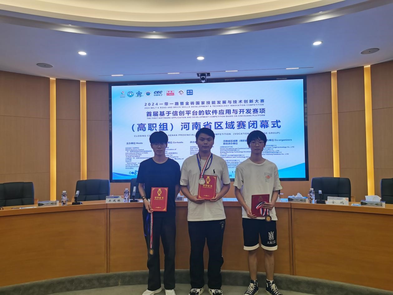 9月20日,2024“一带一路”暨金砖国家技能发展与技术创新大赛首届基于信创平台的软件应用与开发赛项(高职组)河南区域赛在河南职业技术学院举行。我校参赛选手表现出色,信息工程系2023级智平1班学生张宇荣获二等奖,2023级软件1班学生肖健、2023级计算机2班学生饶铭轩两位同学荣获三等奖。