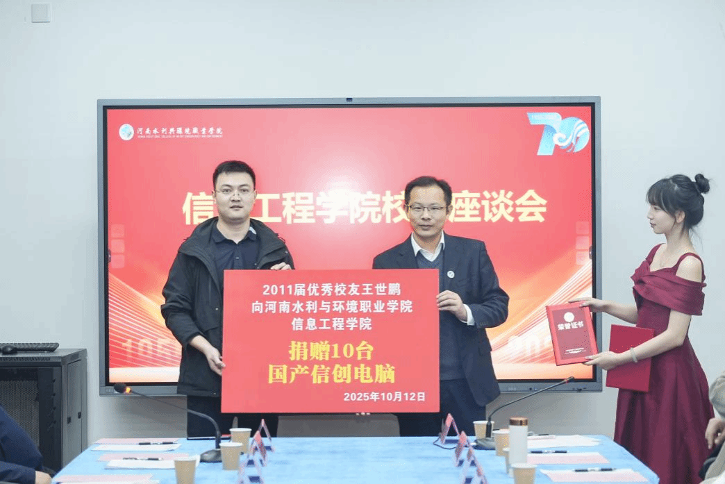 在捐赠仪式环节,校友王世鹏、杭平辉代表各自企业向学院捐赠了一批教学设备与物资,体现了校友心系母校、助力教育的深厚情谊。