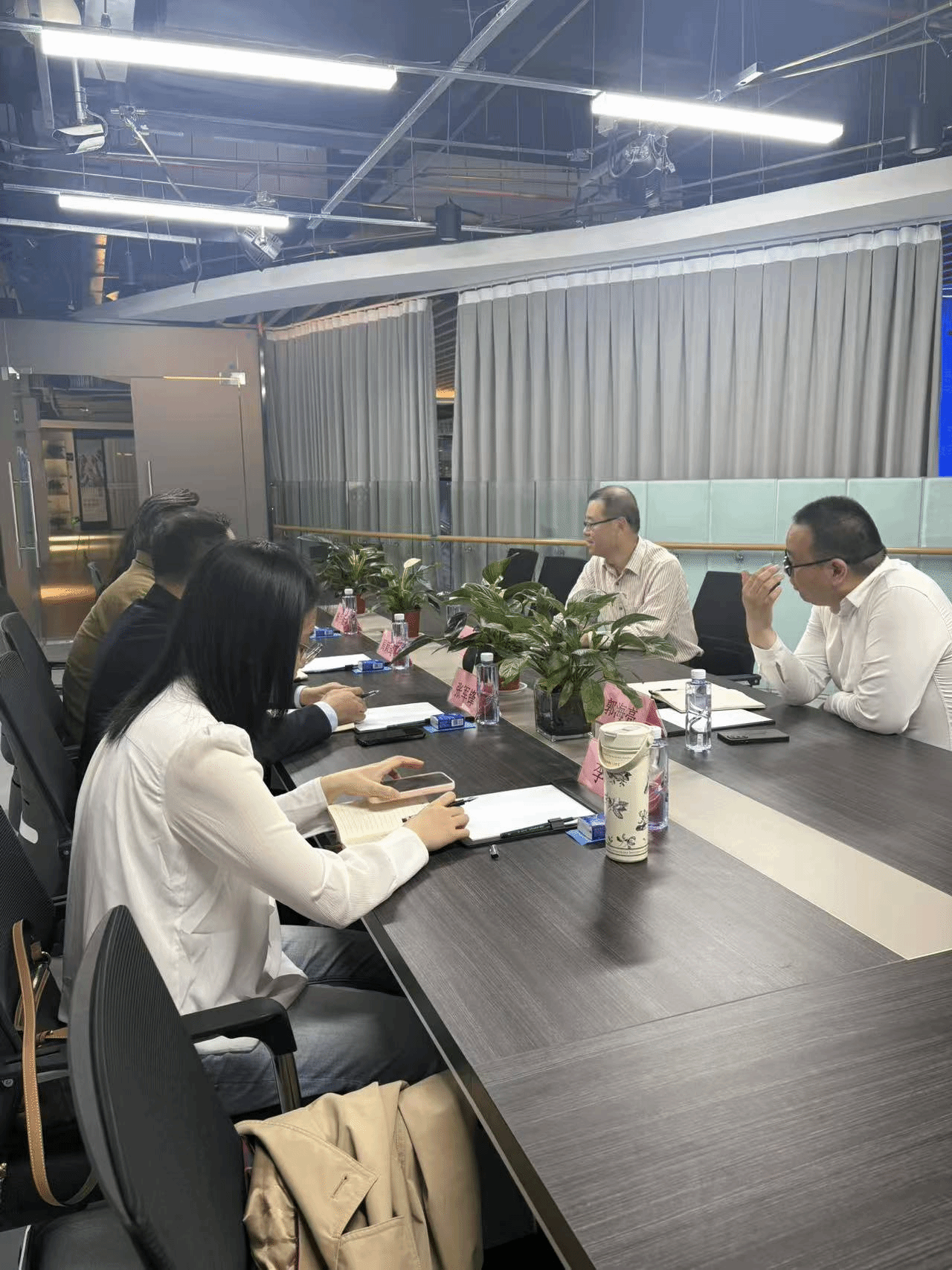 参观结束后,双方举行专题座谈会。座谈会上,杨部长首先代表嗨购集团对学院一行的到来表示热烈欢迎,并全面介绍了集团的经营状况、发展规划及人才需求情况。他表示,嗨购集团作为汽车直播运营领域的头部企业,目前正处于快速发展阶段,在直播技术开发、数据运维、智能营销等岗位上,迫切需要一批具备扎实信息技术功底、较强实践能力的复合型人才,希望能与太阳成城集团tyc234cc建立长期稳定的合作关系,实现优势互补、互利共赢。随后,院长张军锋代表太阳成城集团tyc234cc对嗨购集团的热情接待表示感谢,详细介绍了学院的专业设置、人才培养模式、学生规模、就业去向及学科建设优势,重点阐述了学院在计算机应用、数字媒体、物联网技术等专业的人才培养特色,强调学院培养的学生与企业岗位需求高度契合,期待以此次走访为契机,搭建校企合作桥梁。