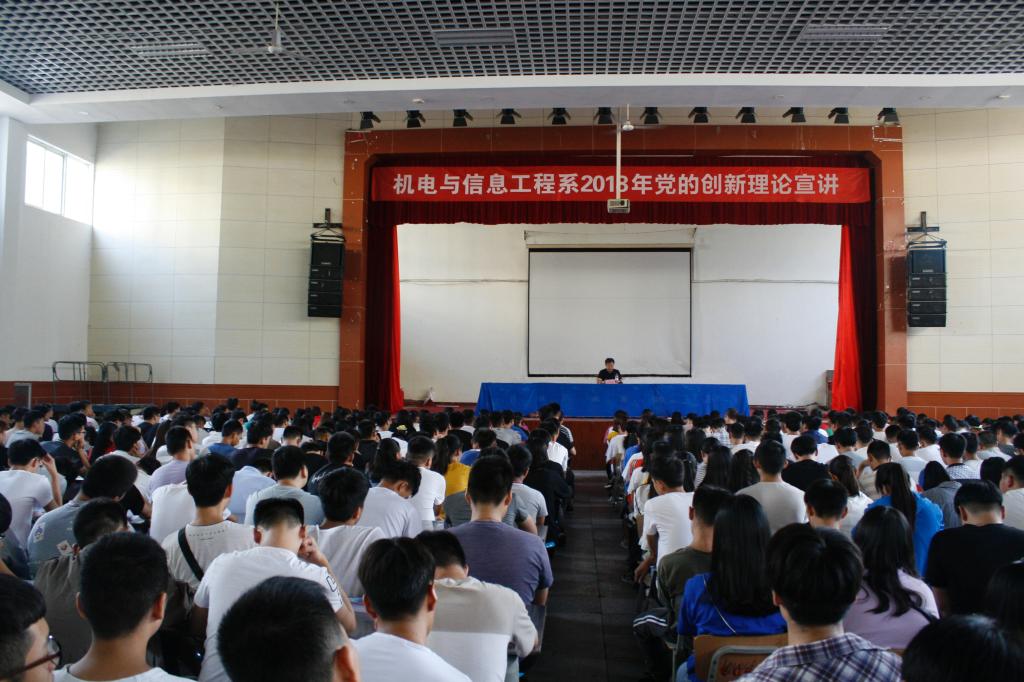 为深入学习贯彻党的十九大精神,坚持不懈推动党的创新理论进教材、进课堂、进头脑。9月10日下午16:30,机电与信息工程系在南苑大礼堂举办“党的创新理论宣讲”活动。全系教职员工及2018级新生参加了本次宣讲会。