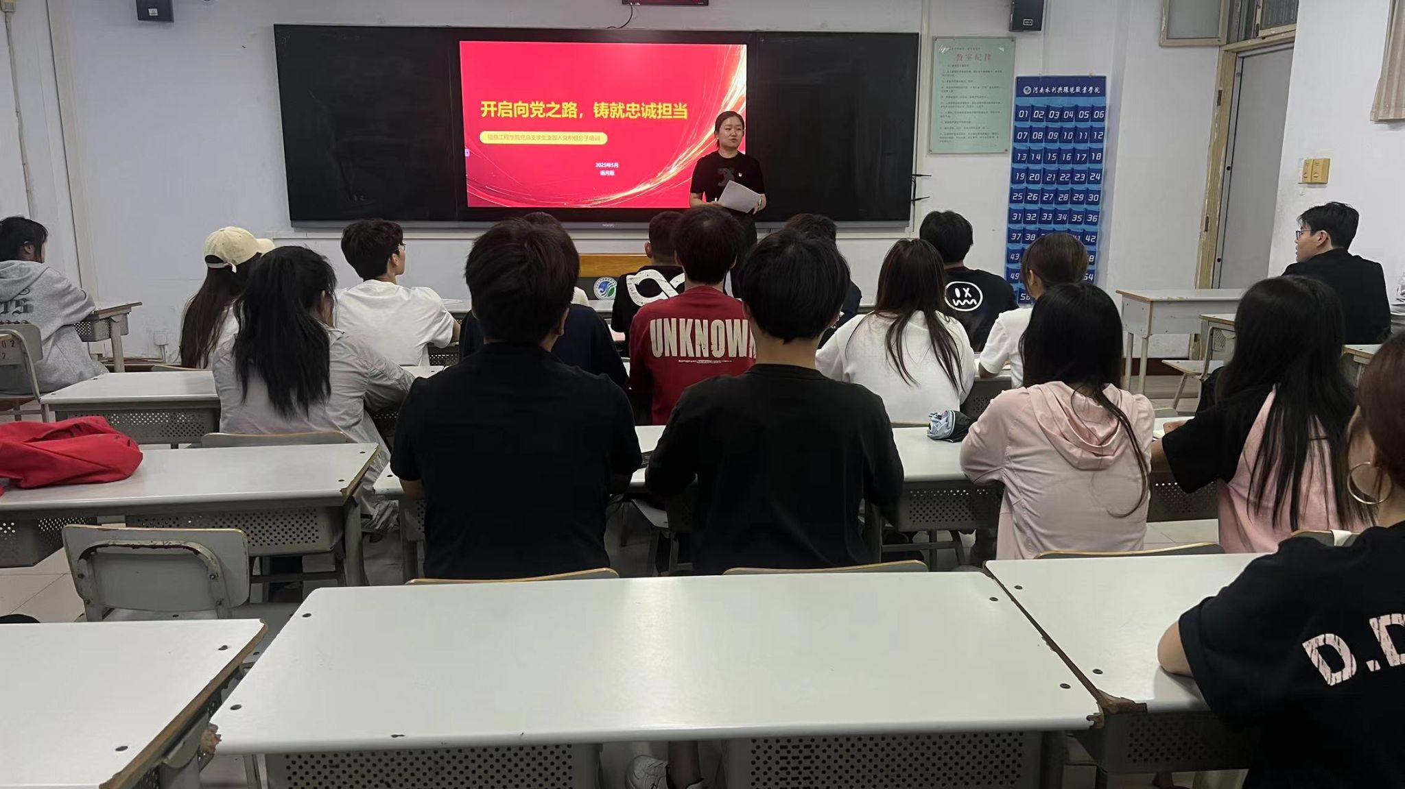 5月26日,太阳成城集团tyc234cc党总支学生支部于南教401教室组织开展入党积极分子专题党课培训。支部书记杨月霞以“开启向党之路,铸就忠诚担当”为主题,围绕党的光辉历程、性质宗旨、党员权利义务、发展党员工作规程及入党动机教育等内容展开系统讲授,着力强化积极分子政治素养与责任意识。