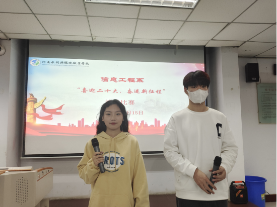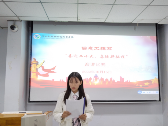 10月15日,信息工程系开展“喜迎二十大,奋进新进程”演讲比赛。同学们踊跃报名,积极参与。经过评比,最终选出一等奖1名,二等奖3名,三等奖5名。通过本次活动,丰富了同学们的课余生活,营造了良好的校园文化氛围,坚定了同学的理想信念和爱党、爱国、爱校的情怀。
