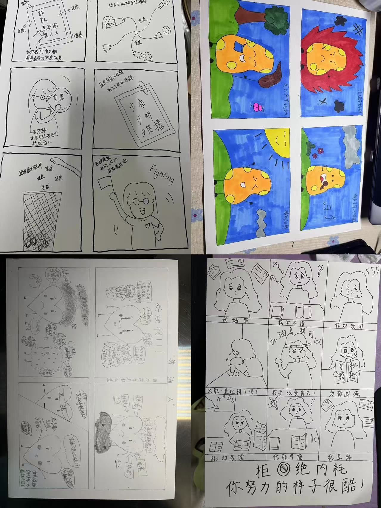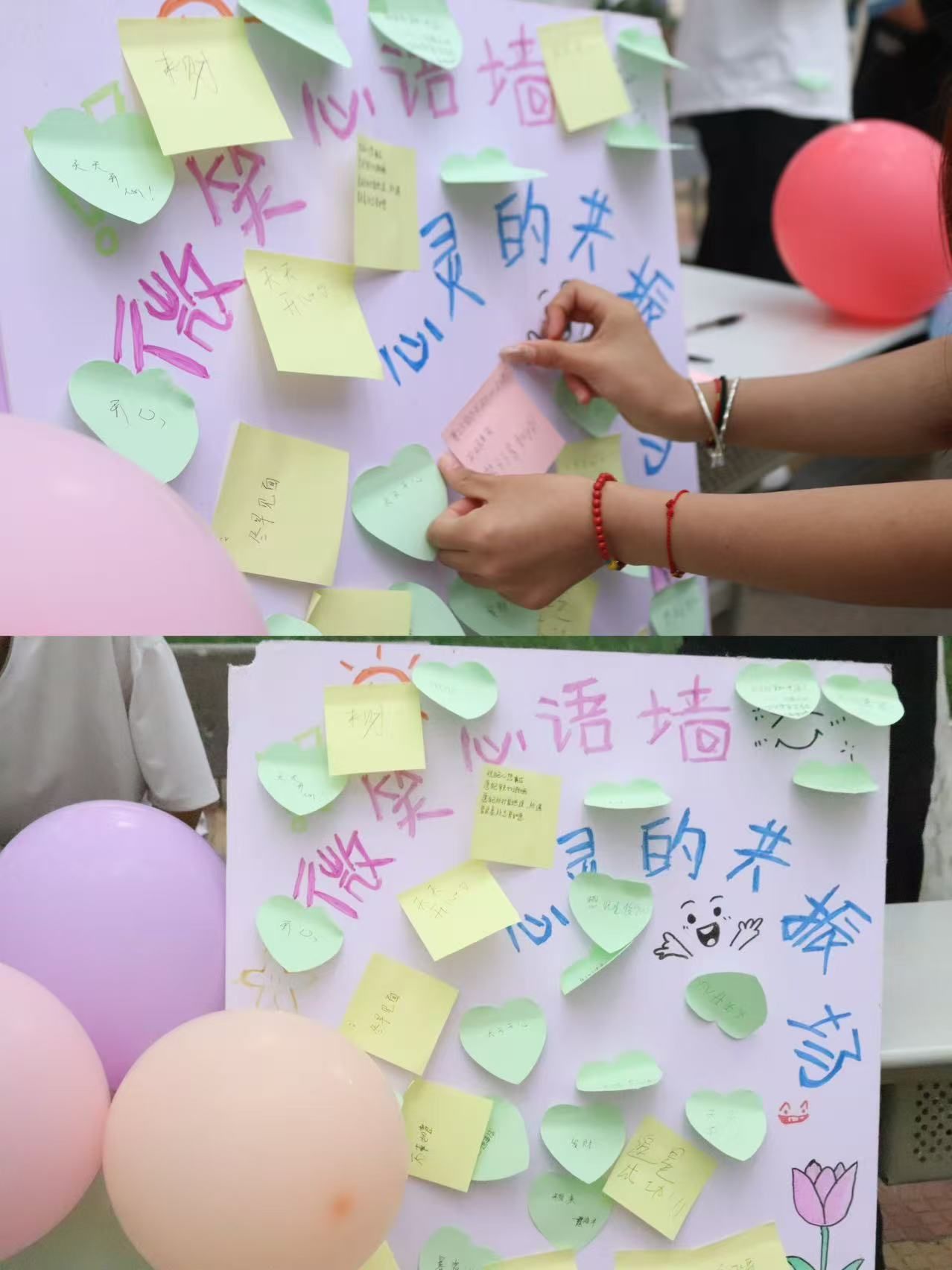 在“心理漫画创作:笔尖上心灵图景”活动中,同学们用画笔勾勒出心灵世界,在创作中感悟生命的美好,促进了心理健康意识的提升。在“微笑心语墙:心灵的共振场”活动中,同学们把快乐、烦恼等情绪写在便利贴,贴至心语墙分享,促进了学生之间的情感交流,帮助大家释放情绪、舒缓压力,营造了积极健康的心理氛围。