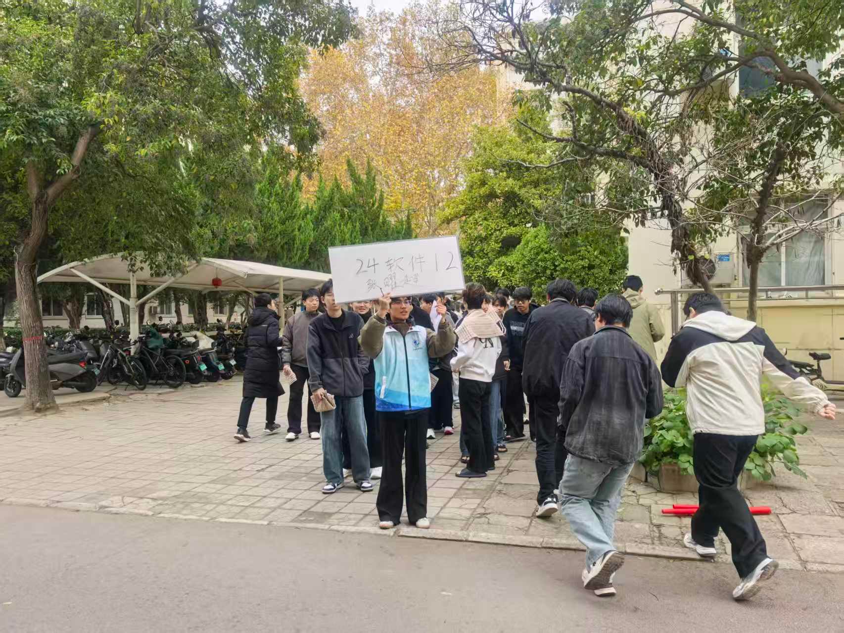 上午10时05分,男生一号公寓楼315宿舍模拟火情触发,消防警报声响起,演练正式拉开帷幕。各楼层引导员与班级干部迅速行动,在辅导员和宿管人员引导下,组织学生用湿毛巾捂住口鼻,弯腰低姿,沿既定路线快速有序撤离。疏散期间,学生相互提醒、彼此帮扶,避免拥挤;关键位置的值守引导员及时疏导人流,保障通道畅通无阻。仅2分半,全体学生便安全抵达宿舍楼前集合区域,各班级负责人迅速清点人数并上报,签到率达100%。