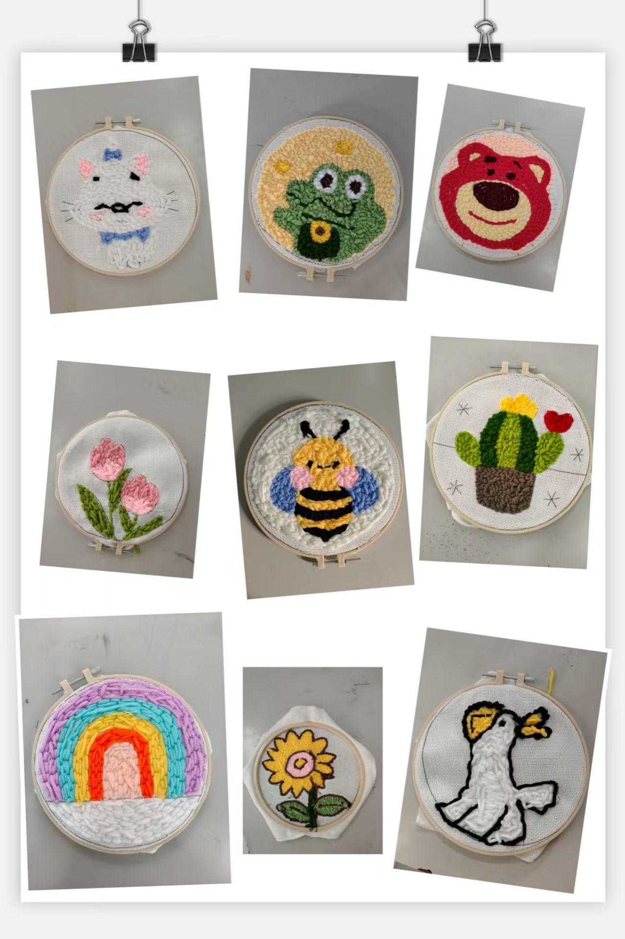 活动现场,工作人员为参与者发放制作材料,并开展基础技法演示与指导,从戳针使用、毛线固定到图案填充逻辑进行细致讲解,助力零基础同学快速上手。现场秩序井然且氛围温馨,部分初次尝试的同学因操作不熟练出现毛线错位等问题,身旁同学主动上前提供帮助、分享经验;同学们可自主选用活动模板进行创作,还有同学在基础模板之上进行创新设计,成品可作为纪念留存,学院全体在校生积极参与其中,在手工创作中感受传统技艺魅力,舒缓了学业压力。